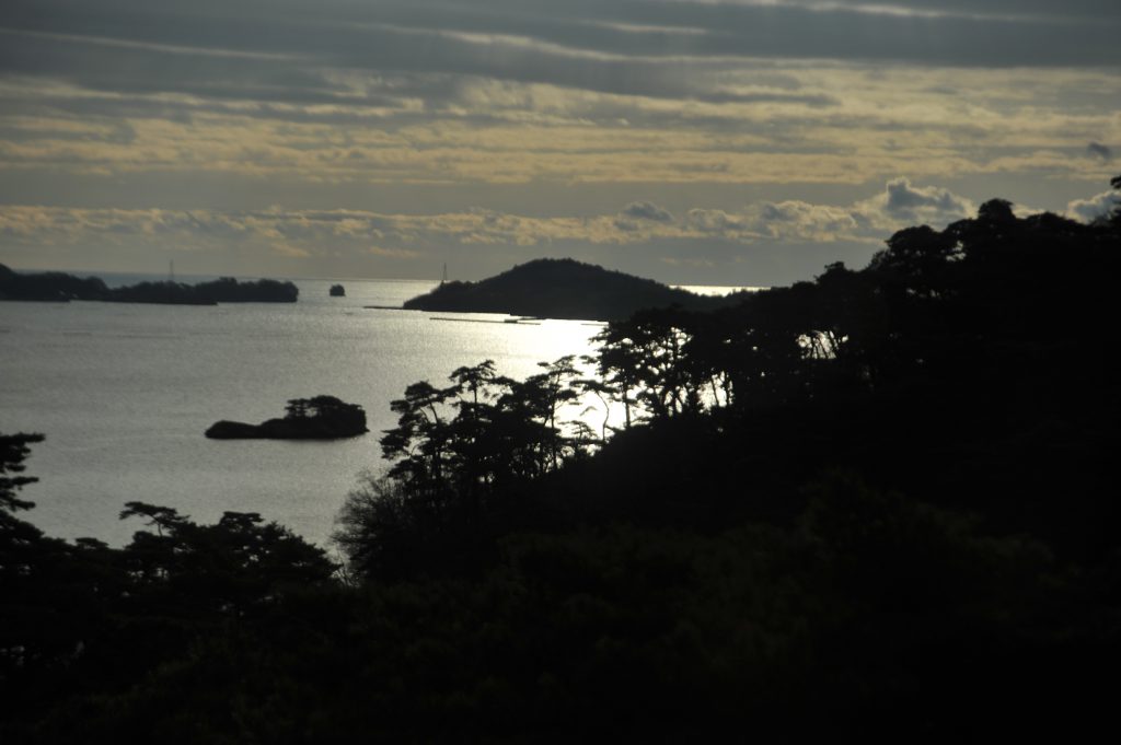 冬の松島湾の水面に差す朝光と島々とのコントラスト